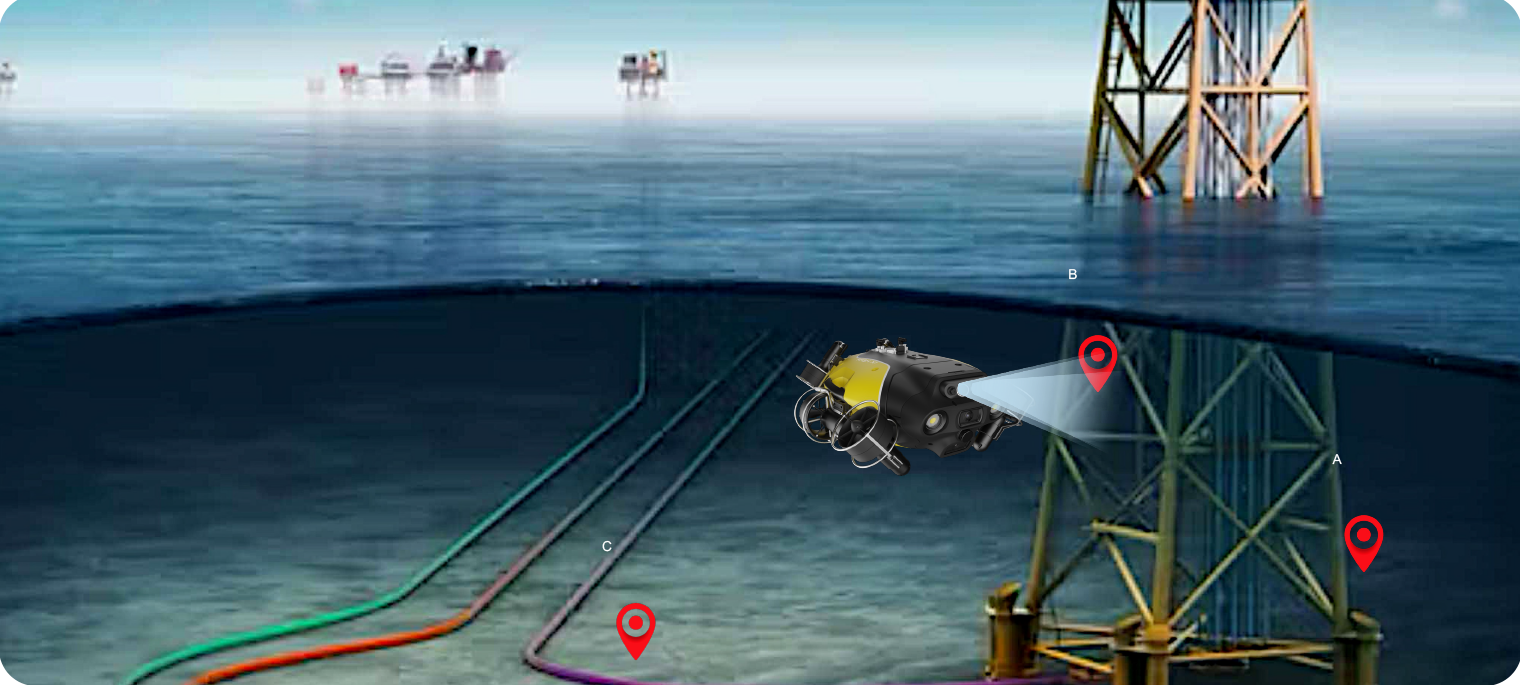 The FIFISH X1’s built-in inertial navigation system, paired with a GNSS locator, enables location-tagged non-destructive testing of structures and platforms. It offers an intuitive, real-time display of the ROV's precise location during inspections, while accurately recording and storing the spatial coordinates of inspection points<br> on the target structure and area.